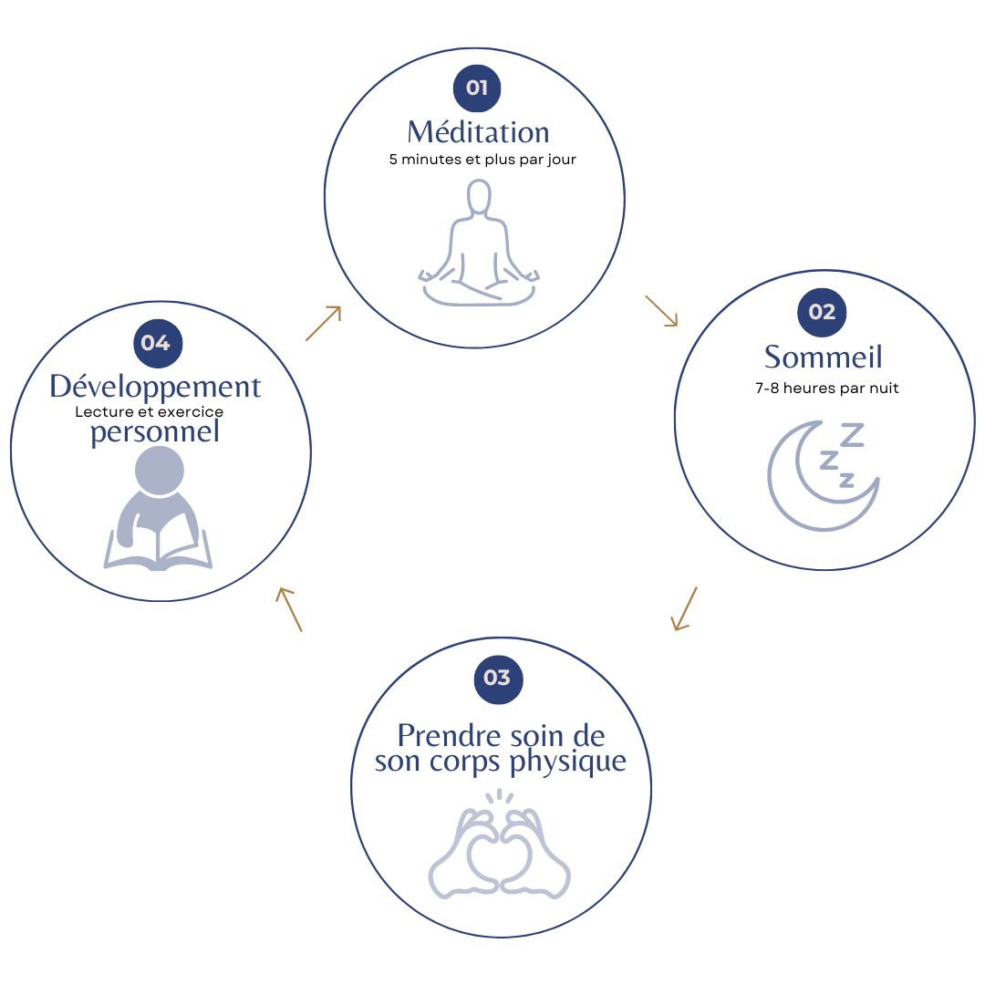 1. MÉDITATION - 5 minutes et plus par jour (5 étant une habitude bien ancrée)